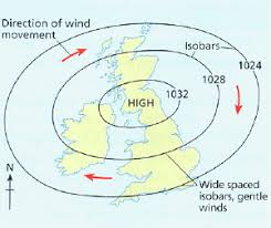 Unlike depressions, anticyclones are areas of high pressure cause by descending air. The chances of rain are slim as the descending air prevents air from rising and therefore forming clouds. Winds also travel clockwise, the opposite of depressions. Anticyclones can be separated further into two main types, winter and summer anticyclones. In winter, cloudless skies result in bright but cold conditions. As there is no cloud heat it lost rapidly into the atmosphere and this is what causes frost to appear on the ground in the early morning. If the air is particularly heavy with moisture from the surrounding seas then can condense into mist and fog. In the summer time the sun is much stronger due to Earths’ rotation on its axis and is easily able to burn away and resulting mist and fog. Summer anticyclones typically result in dry, sunny conditions (of which we see very little these days). The below diagram is a basic example of an anticyclone situated over the UK.